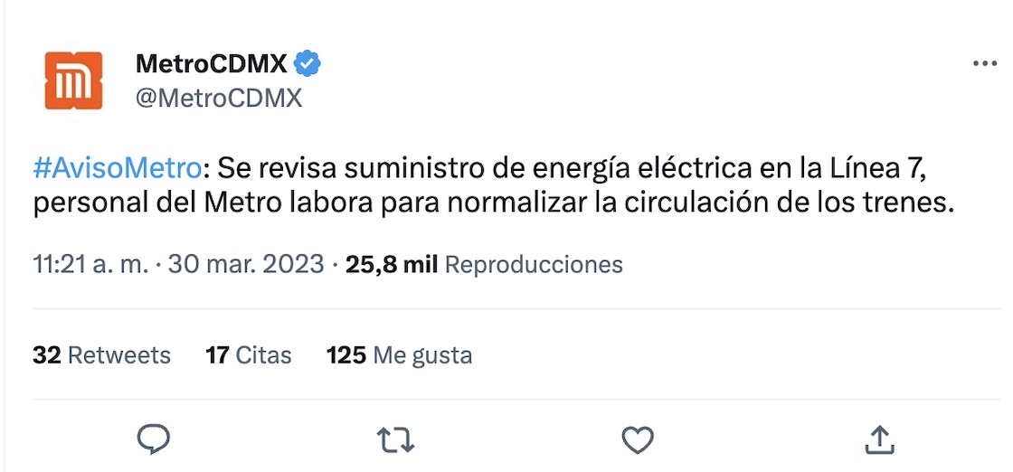 A las 11:21 el Metro colgó este mensaje en su cuenta de Twitter: “Se revisa suministro de energía eléctrica en la Línea 7, personal del Metro labora para normalizar la circulación de los trenes”.