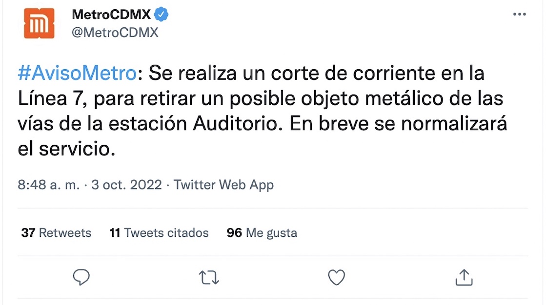 Chequen: a las 8:48 , el Metro informó en su cuenta de Twitter que habían hecho un corte de corriente en la Línea 7 —que corre de El Rosario a Barranca del Muerto— por un posible objeto metálico en ls vías de la estación Auditorio.