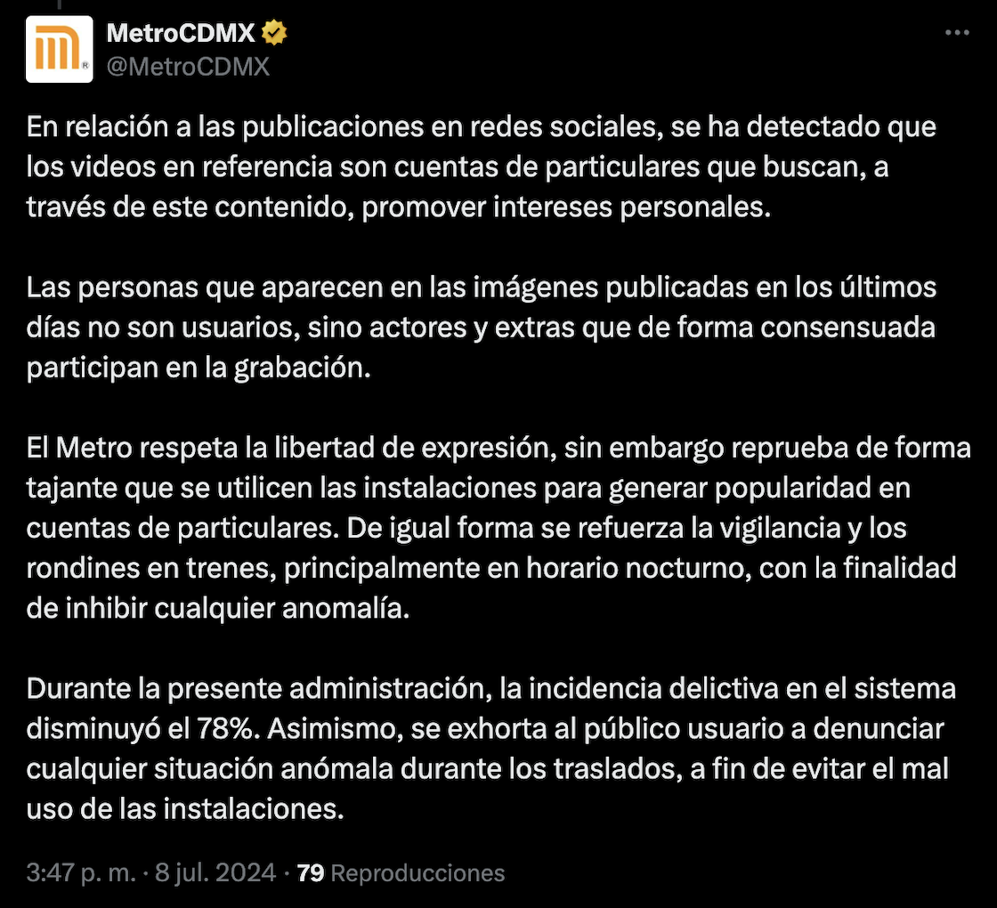 En un breve comunicado publicado en sus redes sociales, el Metro de CDMX respondió a la polémica del video de Mujer Luna Bella explicando que… no eran pasajeros normales, sino actores, quienes participaron en la grabación.
