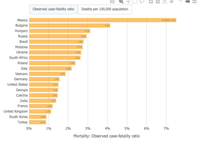 De estos 20 países (que incluyen a Rusia, Brasil, Sudáfrica, Italia, Alemania, Estados Unidos), México ocupa el primer lugar en la tasa de letalidad observada con un 7.5%.