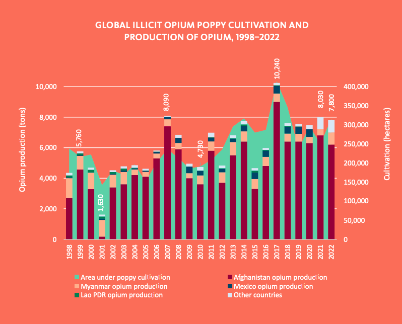 Aunque la superficie mundial dedicadas cultivo de amapola aumentó en más de 26% en 2022, respecto al 2021, la producción mundial de opio disminuyó un 3% durante el mismo periodo.