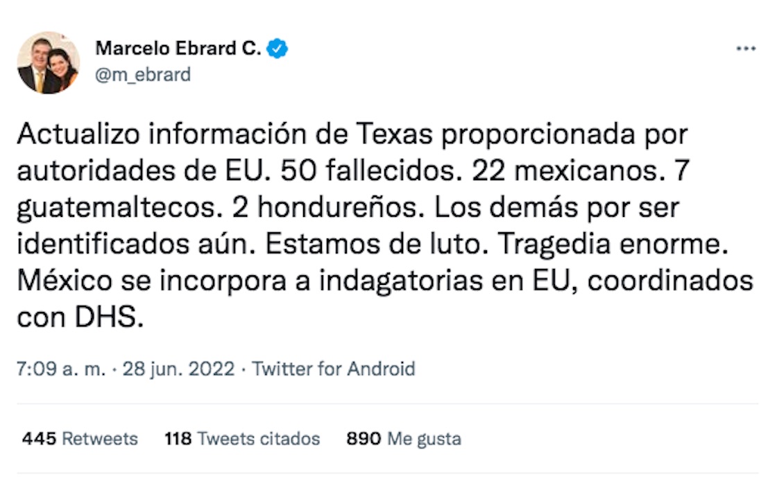 “Actualizo información de Texas proporcionada por autoridades de EU. 50 fallecidos. 22 mexicanos. 7 guatemaltecos. 2 hondureños. Los demás por ser identificados aún. Estamos de luto. Tragedia enorme. México se incorpora a indagatorias en WU, coordinados con DHS”.