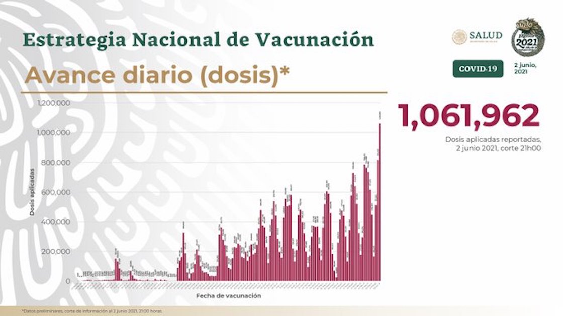 Y esta mañana despertamos con una gran noticia y es que la aplicación de las dosis contra el COVID-19 superó el millón. De acuerdo con la misma Secretaría de Salud, el balance está en un millón 61 mil 962 dosis aplicadas en un día, el 2 de junio.