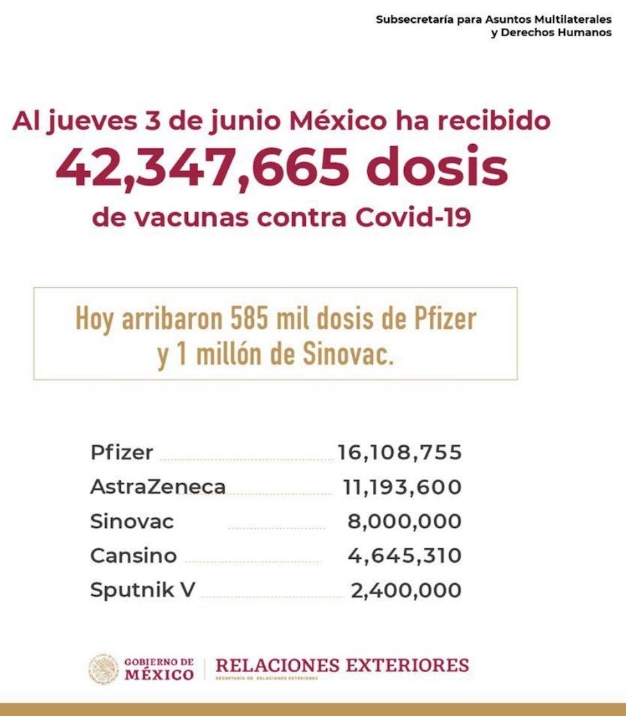 ¿Qué hay de los lotes que han llegado a México?, ¿cuántas vacunas lleva nuestro país? Con corte al 3 de junio, la Secretaría de Relaciones Exteriores (SRE) detalló que se han recibido 42 millones 347 mil 665 dosis de vacunas de COVID-19 —la mayoría han sido de Pfizer-BioNTech, que ha entregado 16 millones 108 mil 755 dosis.