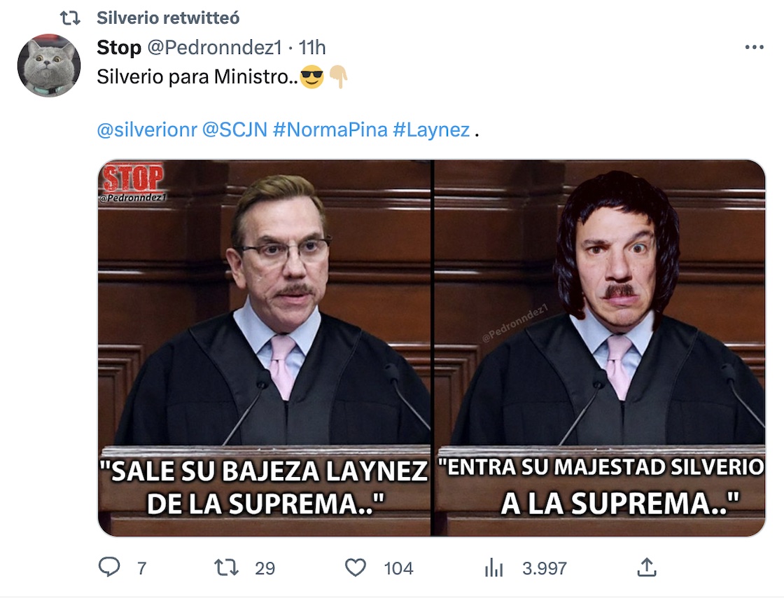 Enrique Galván Ochoa se dio tiempo de citar un tuit con las fotos de Silverio —adjudicadas gacho al ministro Laynez, con esta leyenda: “Toga de día, tanga de noche”. Y los ataques siguieron rolando.