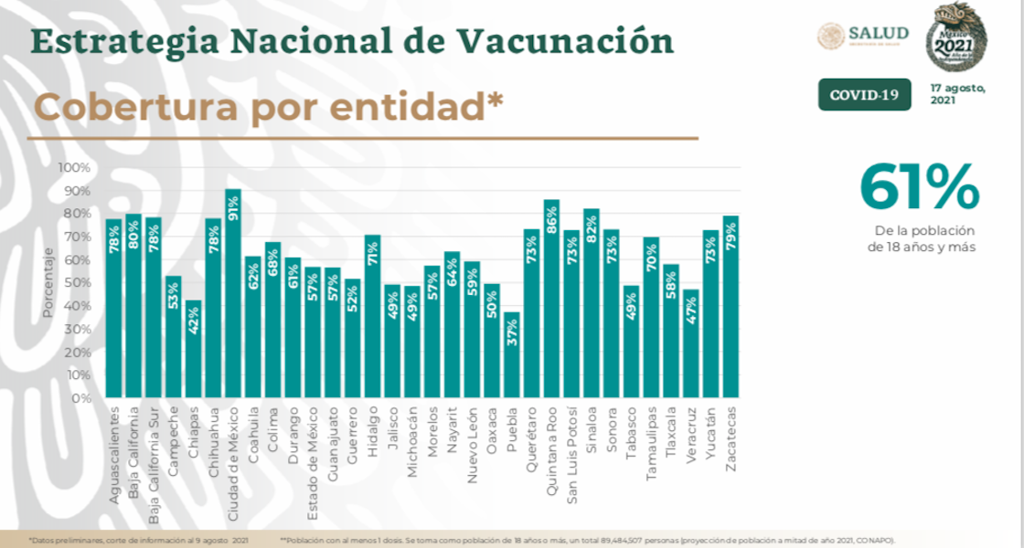 Hasta el martes 17 de agosto, la aplicación de dosis llegó a 78 millones 98 mil 989, mientras que el número de personas vacunadas contra COVID-19 alcanzó las 54 millones 872 mil 594.