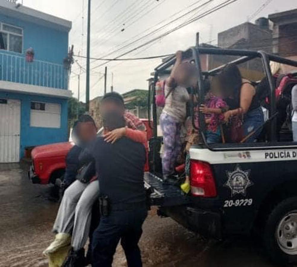 “En atención a un llamado del C5i, que alertaba personas y niños atrapados en una escuela inundada, ubicada en la colonia Quinceo de Morelia, agentes de Tránsito y Movilidad efectuaron labores de rescate; fueron evacuados sin que pasará a mayores”. Foto: Secretaría de Seguridad Pública de Michoacán Facebook.