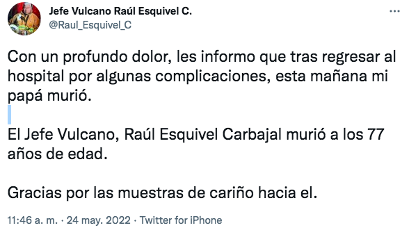 Tras permanecer intubado y luchar en el hospital por un padecimiento intestinal, Raúl Esquivel, mejor conocido como el Jefe Vulcano, murió la mañana de este 24 de mayo a los 77 años.