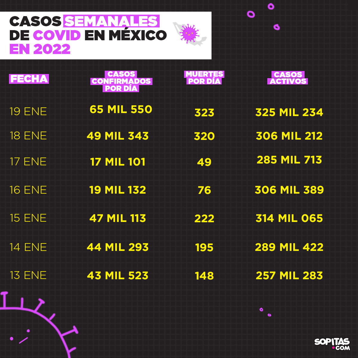 De acuerdo con la Secretaría de Salud federal, hasta este 19 de enero de 2022 en México hay un total de 4 millones 494 mil 310 casos acumulados confirmados de COVID-19, así como 302 mil 112 lamentables defunciones.