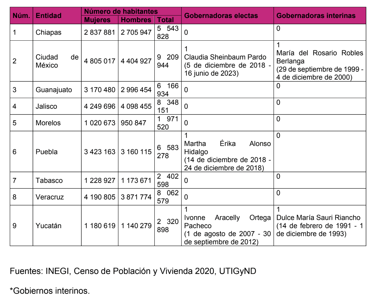 En el texto del proyecto, el INE presentó una Tabita que muestra los estados que van a renovar la gubernatura en el 2024. Cuál es el número total de habitantes y cuántas gobernadoras mujeres ha tenido en la historia, ya sea electas o interinas.