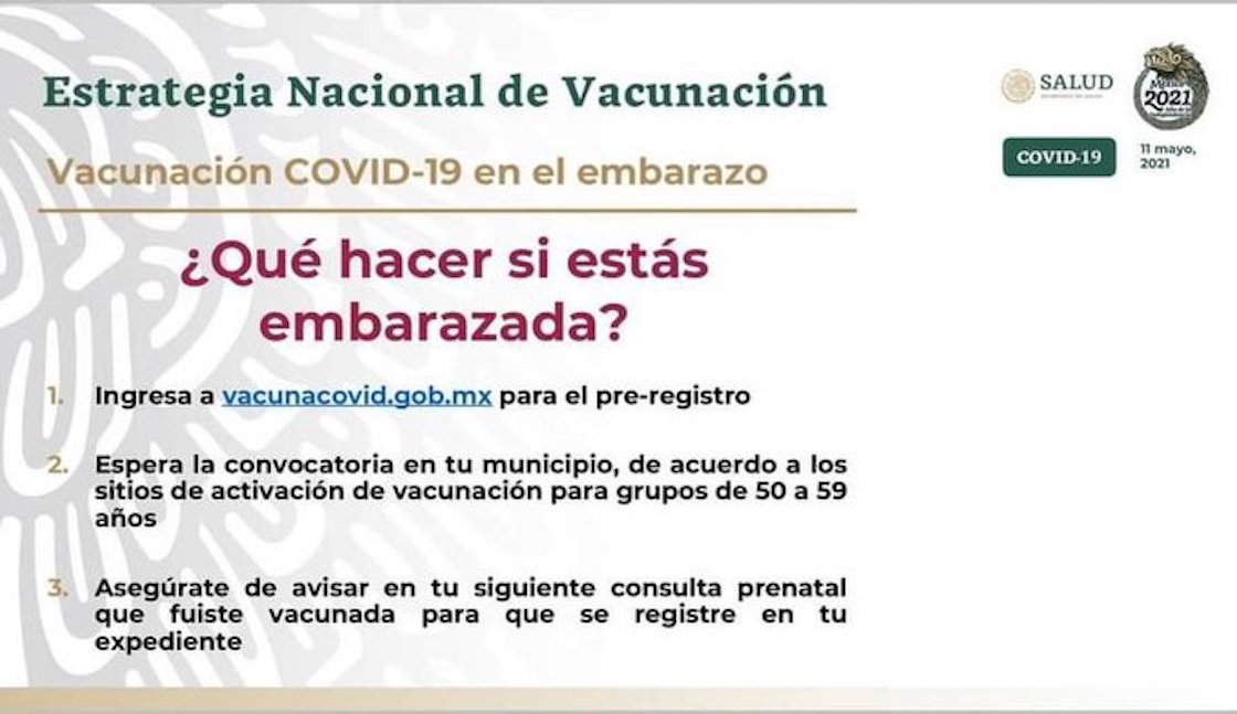 “(Ahí) Encontrarán la liga directa para el prerregistro, toda mujer embarazada debe esperar también cuándo llegan las vacunas y cuándo se activan los puestos de vacunación en los municipios de residencia, concurrentemente con los sitios que se están activando en todos los municipios, los puestos de vacunación para la población de 50 a 59”.