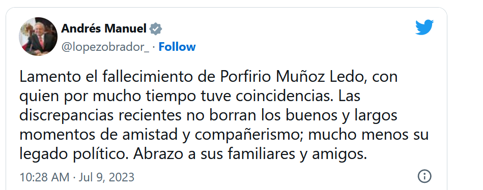 “Lamento el fallecimiento de Porfirio Muñoz Ledo, con quien por mucho tiempo tuve coincidencias. Las discrepancias recientes no borran los buenos y largos momentos de amistad y compañerismo; mucho menos su legado político. Abrazo a sus familiares y amigos”, fue el mensaje dedicado por AMLO.