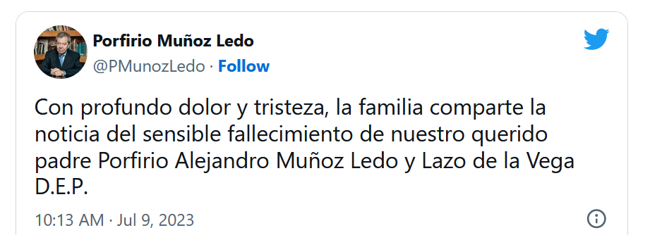 “Con profundo dolor y tristeza, la familia comparte la noticia del sensible fallecimiento de nuestro querido padre Porfirio Alejandro Muñoz Ledo y Lazo de la Vega D.E.P”, con ese mensaje, se confirmó la muerte de Porfirio Muñoz Ledo a través de sus cuentas oficiales de redes sociales.