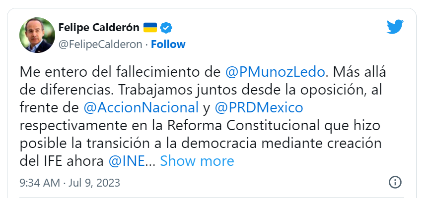 “Me entero del fallecimiento de Porfirio Muñoz Ledo. Más allá de diferencias. Trabajamos juntos desde la oposición, al frente de Acción Nacional y PRD respectivamente en la Reforma Constitucional que hizo posible la transición a la democracia mediante creación del IFE ahora INE independiente y la regulación de campañas. Descanse en paz”, fue por ejemplo el mensaje de Felipe Calderón.