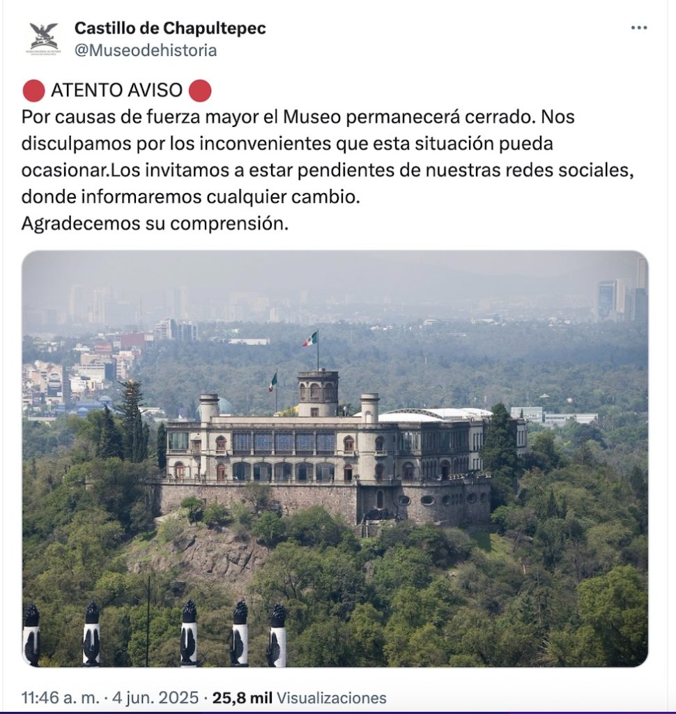 Lo mismo pasó con el Castillo de Chapultepec que el 4 de junio indicó a la gente que esté atenta a sus redes para saber cuándo reabren. Acá el mensaje completo: