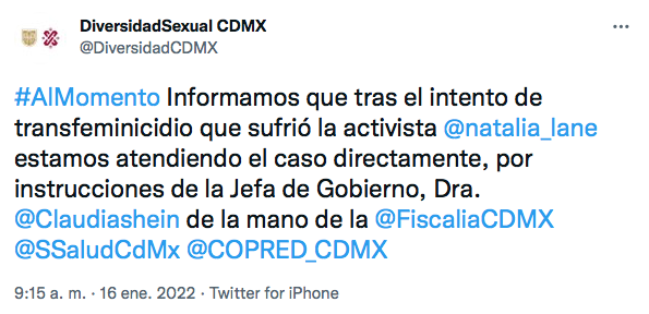 Por su parte, la Fiscalía de la CDMX, con instrucciones de la alcaldesa Claudia Sheinbaum, ya comenzó con las investigaciones correspondientes para dar con el responsable de lo ocurrido a Natalia Lane, quien en redes sociales ha recibido apoyo por parte de la comunidad LGBTQ+, la cual piden justicia y que el gobierno capitalino garantice la seguridad y los derechos a las personas transgénero.