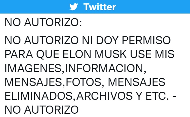 No autorizo. No autorizo ni doy permiso de que Elon Musk use mis imágenes, información, mensajes, fotos, mensajes eliminados, archivos y etc. Pasa este mensaje a 10 contactos para que tu perfil quede protegido“. Incluso hay algunos otros que afirman que al publicar esto en tu cuenta, tu avatar tendrá un marco verde que indica que ya estás protegido.
