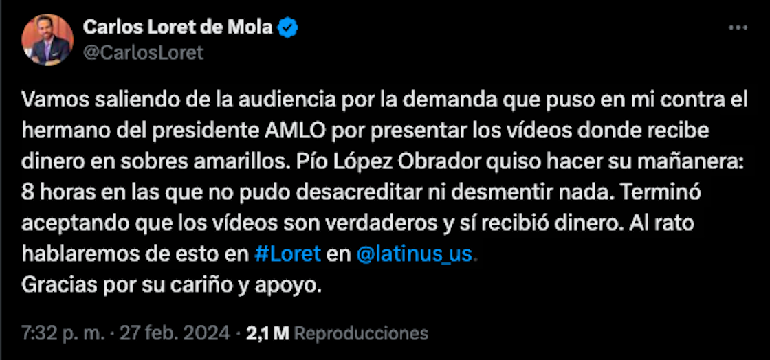 “Vamos saliendo de la audiencia por la demanda que puso en mi contra el hermano del presidente AMLO por presentar los vídeos donde recibe dinero en sobres amarillos. Pío López Obrador quiso hacer su mañanera: 8 horas en las que no pudo desacreditar ni desmentir nada. Terminó aceptando que los vídeos son verdaderos y sí recibió dinero. Al rato hablaremos de esto en Loret en Latinus”