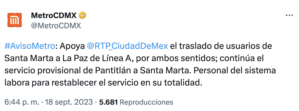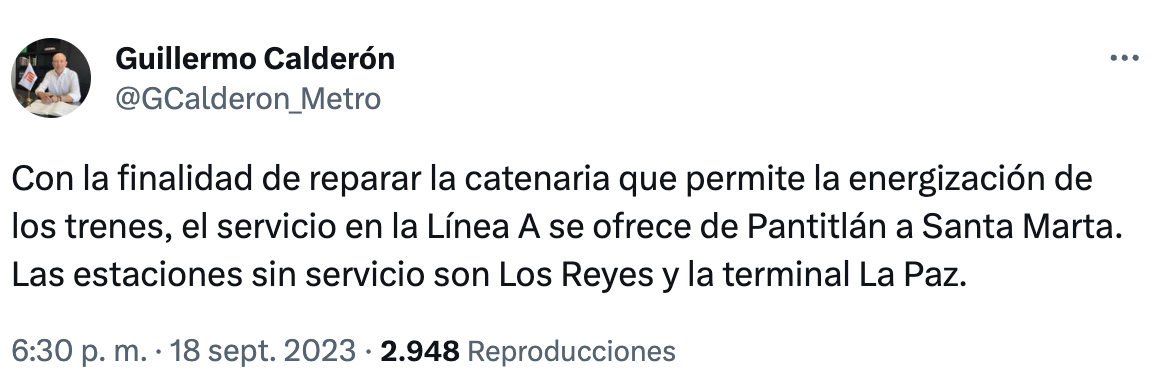 “Debido a la revisión del sistema de suministro eléctrico en la Línea A, se establece servicio provisional de Pantitlán a Santa Marta. No se ofrece servicio de Los Reyes a La Paz. Personal especializado del Metro labora en la zona“, se lee en la publicación de redes sociales.