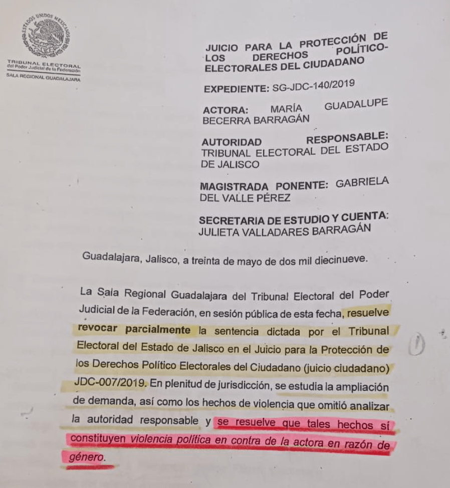 Es por eso que la entonces regidora presentó una demanda de juicio para la protección de sus derechos político-electoral. Finalmente se reconoció que ella había sido víctima de violencia política en razón de género, le otorgaron medidas de protección federales por las amenazas de muerte y tuvo que salir del estado.