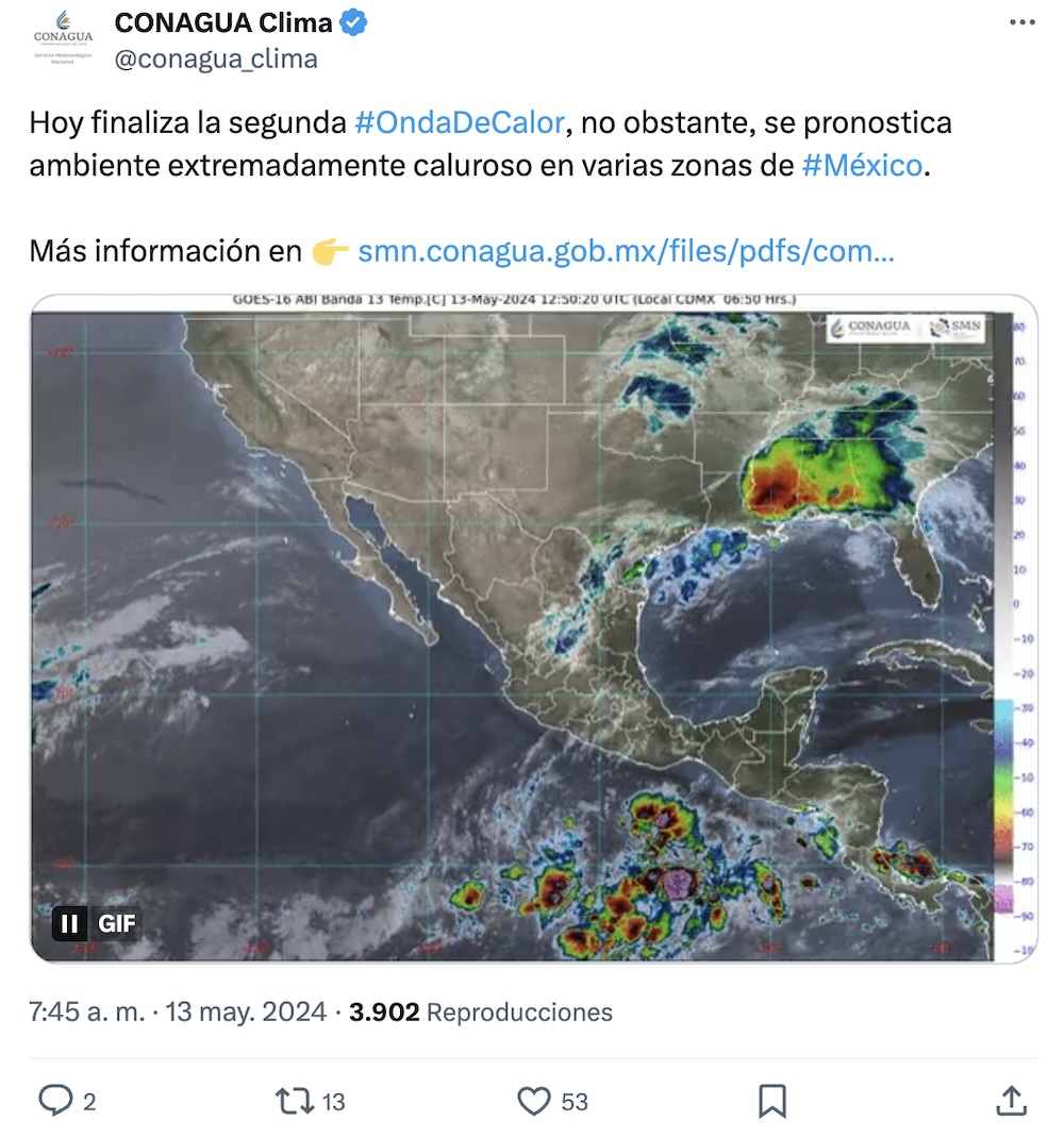 Si bien la segunda ola de calor —que comenzó desde el 3 de mayo— termina este lunes 13, el ambiente extremadamente caluroso seguirá en los estados del sur de México.