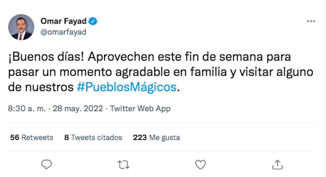 El mismo día que este video roló en redes, el gober publicó en su cuenta de Twitter: “Aprovechen este fin de semana para pasar un momento agradable en familia y visitar alguno de nuestros pueblos mágicos”.