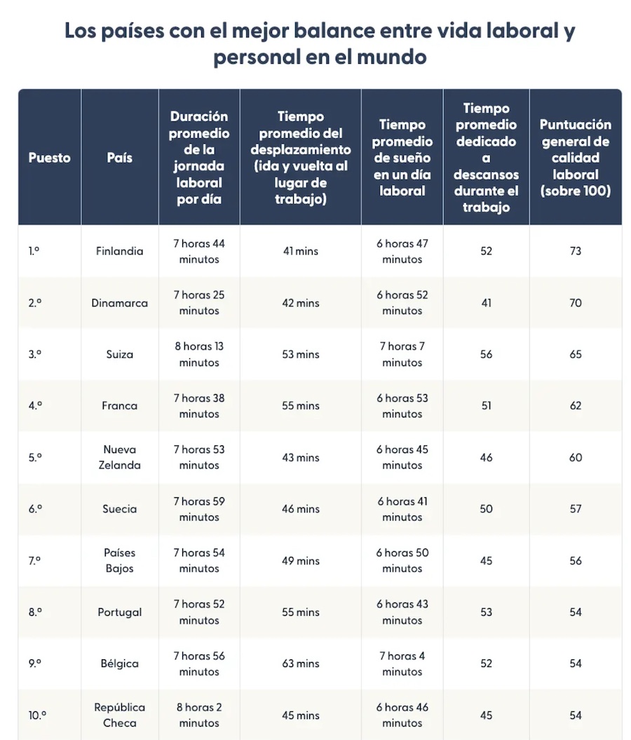 Y, de acuerdo con Remitly, Finlandia es el país con mejor equilibrio para los trabajadores y las trabajadoras porque su jornada laboral promedio es de 7 horas con 44 minutos —una de las más cortas entre los 22 países analizados.