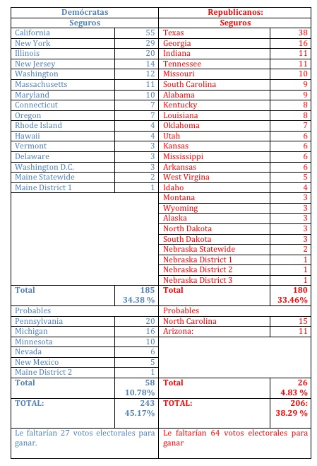 Ahora, veamos cómo está el mapa electoral el día de hoy (nos basamos en los sondeos realizados por The New York Times):