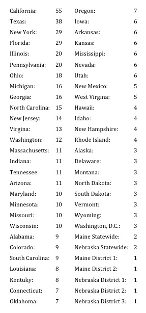La forma en la que se eligen los electores depende de cada estado, pero el número de electores por estado está determinado por el número de miembros que tiene la entidad en el Congreso. En total son 538 electores, cantidad que corresponden a los 435 representantes y 100 senadores, miembros del poder legislativo, y 3 electores extra de Washington D.C.