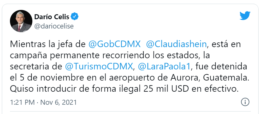 Bueno, todo comenzó con un señalamiento del periodista Darío Celis en Twitter. Él indicó que Paola Félix Díaz, secretaria de Turismo de CDMX, fue detenida este 5 de noviembre luego de viajar en un vuelo privado a Guatemala.