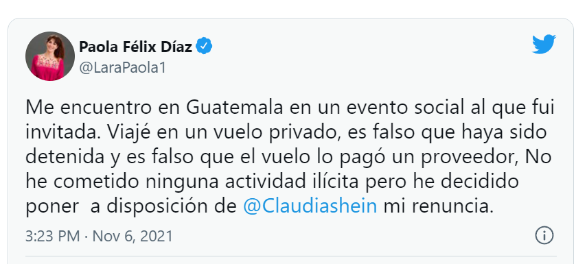 Horas más tarde, la propia funcionaria publicó un tuit para informar el porqué de su viaje a Guatemala y para negar las acusaciones. Pero a pesar de eso, también compartió que ya había puesto sobre la mesa su renuncia a la jefa de Gobierno.