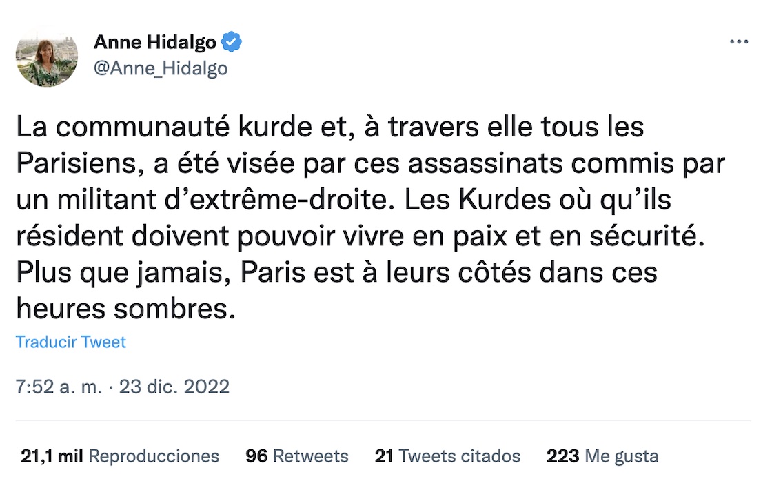 “La comunidad kurda y, a través de ella, todos los parisinos, fue blanco de estos asesinatos cometidos por un activista de extrema derecha. Los kurdos, donde quiera que residan, deben poder vivir en paz y seguridad. Más que nunca, París está a su lado en estas horas oscuras”.
