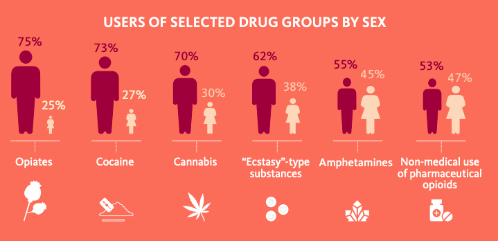 La proporción de mujeres usuarias es mayor en el caso de los estimulantes de tipo anfetamínico (45%) y el uso no médico de productos farmacéuticos (entre el 45 y el 49%). El consumo en hombres es mayor en opiáceos (un 75%) y cocaína (un 73%).