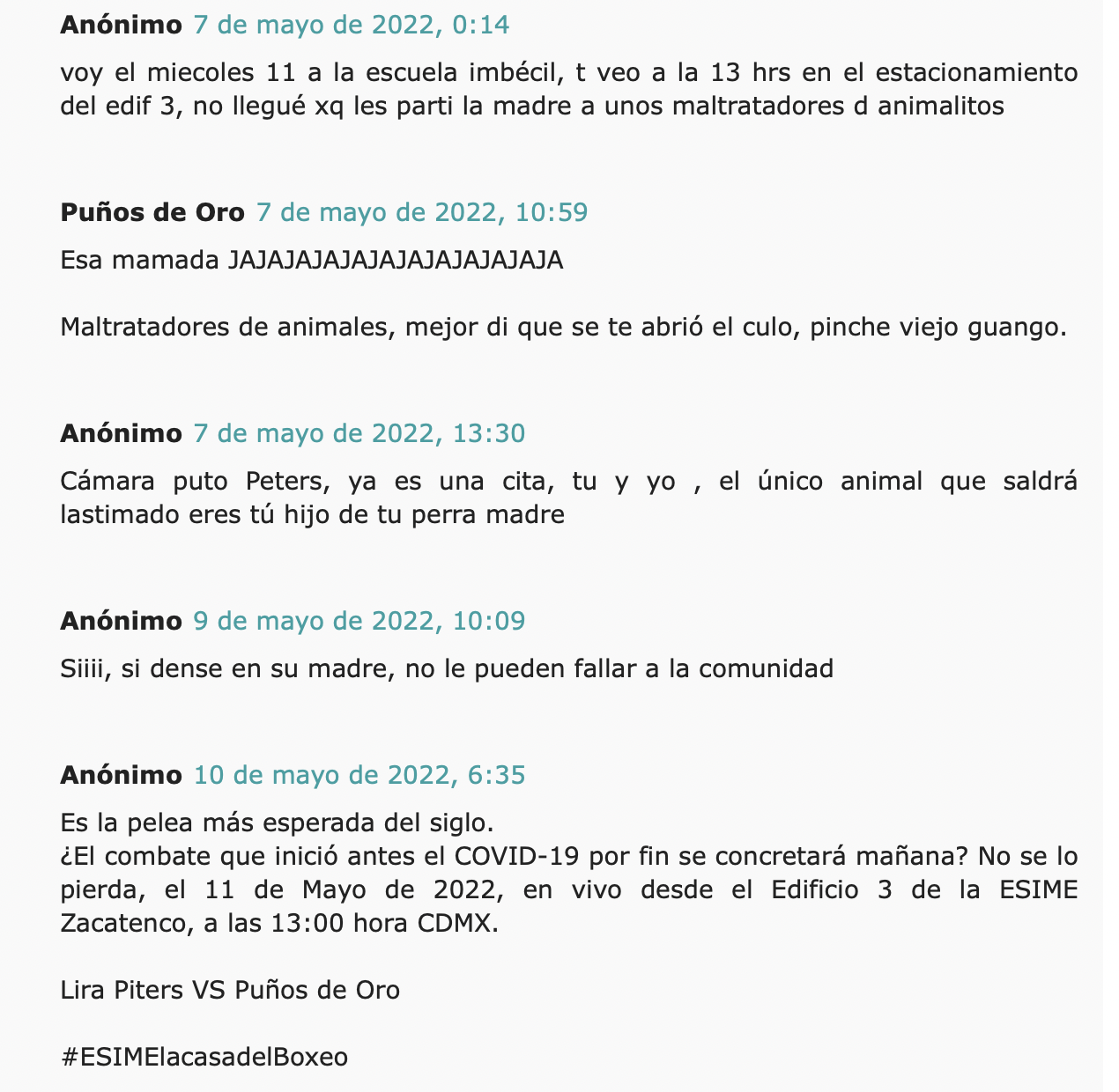 Una cuenta Anónima —que los alumnos aseguran se trataba del propio Peters revisando lo que los alumnos decían—, le cantó un tiro a otra cuenta llamada El Puños de Oro. Quedaron de verse el 11 de mayo a la 1 de la tarde en el estacionamiento del Edificio 3 de la ESIME Zacatecnco.