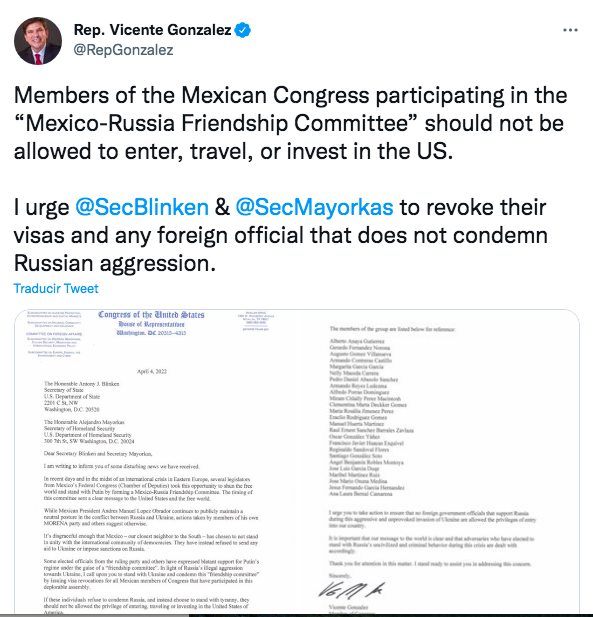 ¿Y qué creen? Recientemente el congresista demócrata por Texas, Vicente González, envió una carta al secretario del Estado, Antony Blinken, y al secretario de Seguridad Nacional, Alejandro Mayorkas, para pedir que les quiten las visas estadounidenses a los diputados mexicanos que participaron en este grupo de amistad con Rusia.