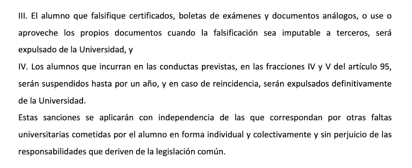 Se trata de los artículos 95 y 97 del Estatuto General de la UNAM. El 95 señala las causas graves de responsabilidad y aplica para toda la comunidad universitaria y el 97 define las sanciones.
