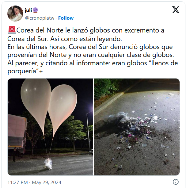Bueno, a lo mejor sí. Pero la razón oficial, según cita CNN de la agencia central norcoreana KCNA, es que los globos con basura y desechos son una respuesta a lo que consideran una afrenta desde Corea del Sur.