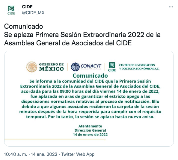Por medio de un comunicado, la dirección general del CONACYT informó a la comunidad del Centro de Investigación y Docencia Económicas (CIDE) que la sesión que se tenía programada para este 14 de enero de la Asamblea General de Asociados del CIDE será pospuesta hasta nuevo aviso.