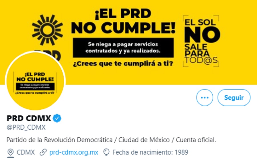 Parecía broma, pero no. En la cuenta oficial del PRD-CDMX se difundió un desplegado que lleva horas sin ser quitado (o contestado), en el cual se acusa que el propio partido “no cumple”, esto debido a que se ha hecho de la vista gorda a la hora de pagar por servicios recibidos.