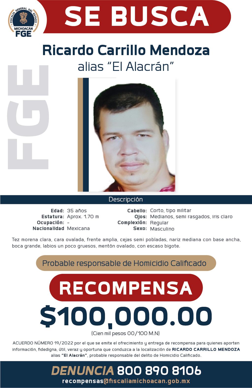 El supuesto homicida de César Arturo Valencia Caballero, alcalde de Aguililla asesinado el pasado 10 de marzo, es identificado como Ricardo Carrillo Mendoza, El Alacrán. El juez de control que lleva el caso ya libró la orden de aprehensión en su contra y, para dar con él lo más pronto posible, se autorizó ofrecer una recompensa para su localización.