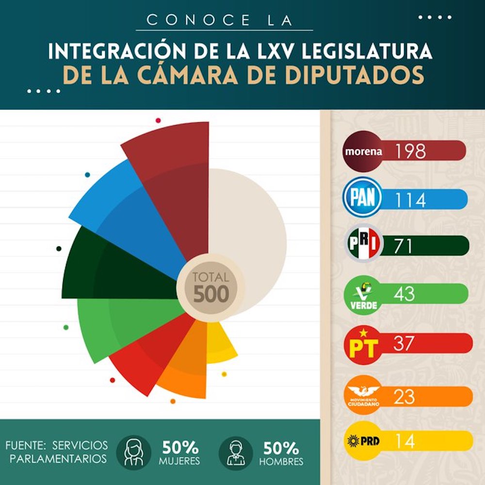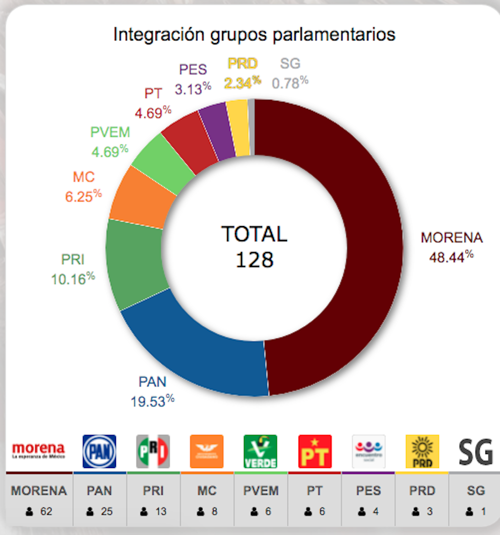 Son 62 en la bancada morenista, 25 en el PAN, 13 en el PRI, 8 en MC, 6 en el Verde Ecologista, 6 en el PT, 4 en el PES, 3 en el PRD y 1 sin grupo parlamentario.