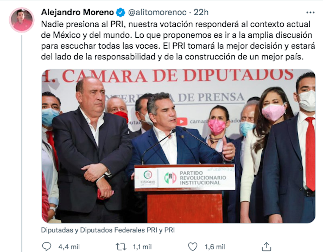 Como ven, el PRI tiene de dos sopas: afianzar su lugar en el Congreso de la Unión y sus intereses con Presidencia —mediante el voto a favor de esta reforma— o reforzar sus lazos con el PAN y PRD para las próximas elecciones, porque como sea, sin esta alianza el Revolucionario Institucional no hubiera hecho mucho en las elecciones de 2021.
