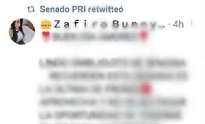Por breve tiempo, se pudo ver en mensajes difundidos desde cuentas dedicadas a ofrecer servicios sexuales la marca del retuit ofrecido por “Senado PRI”… lo cual, obviamente, fue comentado por varios usuarios de las redes… bueno, los que alcanzaron a ver el detalle, porque tampoco es que mucha gente esté al pendiente de lo que tuitean los de la bancada tricolor.
