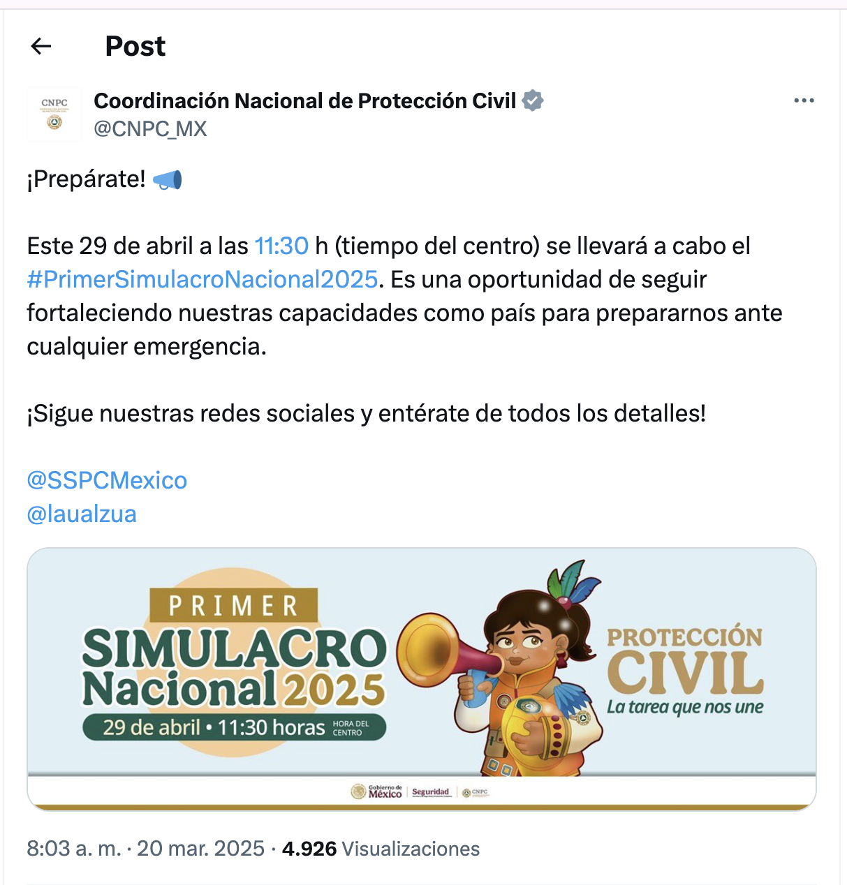 “Con el propósito de fomentar la cultura de la Protección Civil en la población y contribuir con el fortalecimiento de las capacidades de reacción de las unidades internas y sus brigadas ante la eventualidad de una emergencia o desastre, el Gobierno de México, a través de la Secretaría de Seguridad y Protección Ciudadana y la Coordinación Nacional de Protección Civil convoca a instituciones públicas y privadas a nivel nacional a participar en el 1er Simulacro Nacional 2025“. Coordinación Nacional de Protección Civil,