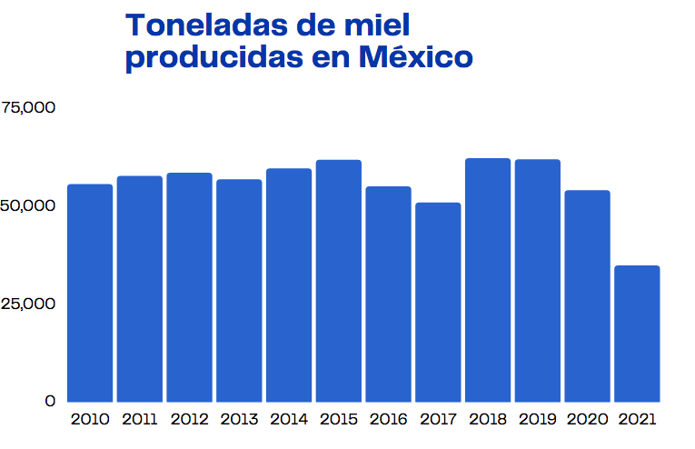 Hablando específicamente de la miel, hasta 2019 México era el cuarto exportador más grande de miel en el mundo y de acuerdo con el Servicio de Información Agroalimentaria y Pesquera (SIAP), hasta julio de 2021 México ha producido 34 mil 892 toneladas de miel.