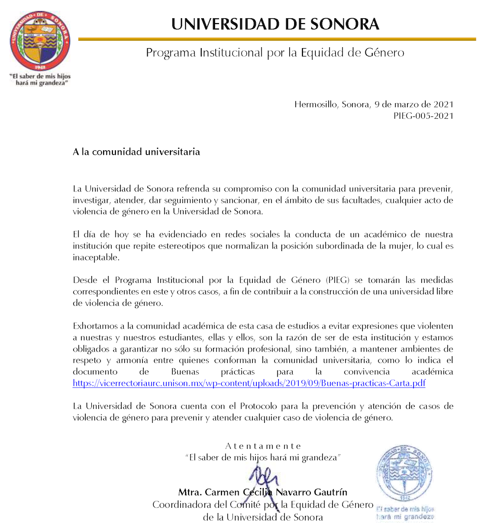 “La Universidad de Sonora refrenda su compromiso con la comunidad universitaria para prevenir, investigar atender, dar seguimiento, y sancionar en el ámbito de sus facultades cualquier acto de violencia de género en la Universidad de Sonora.