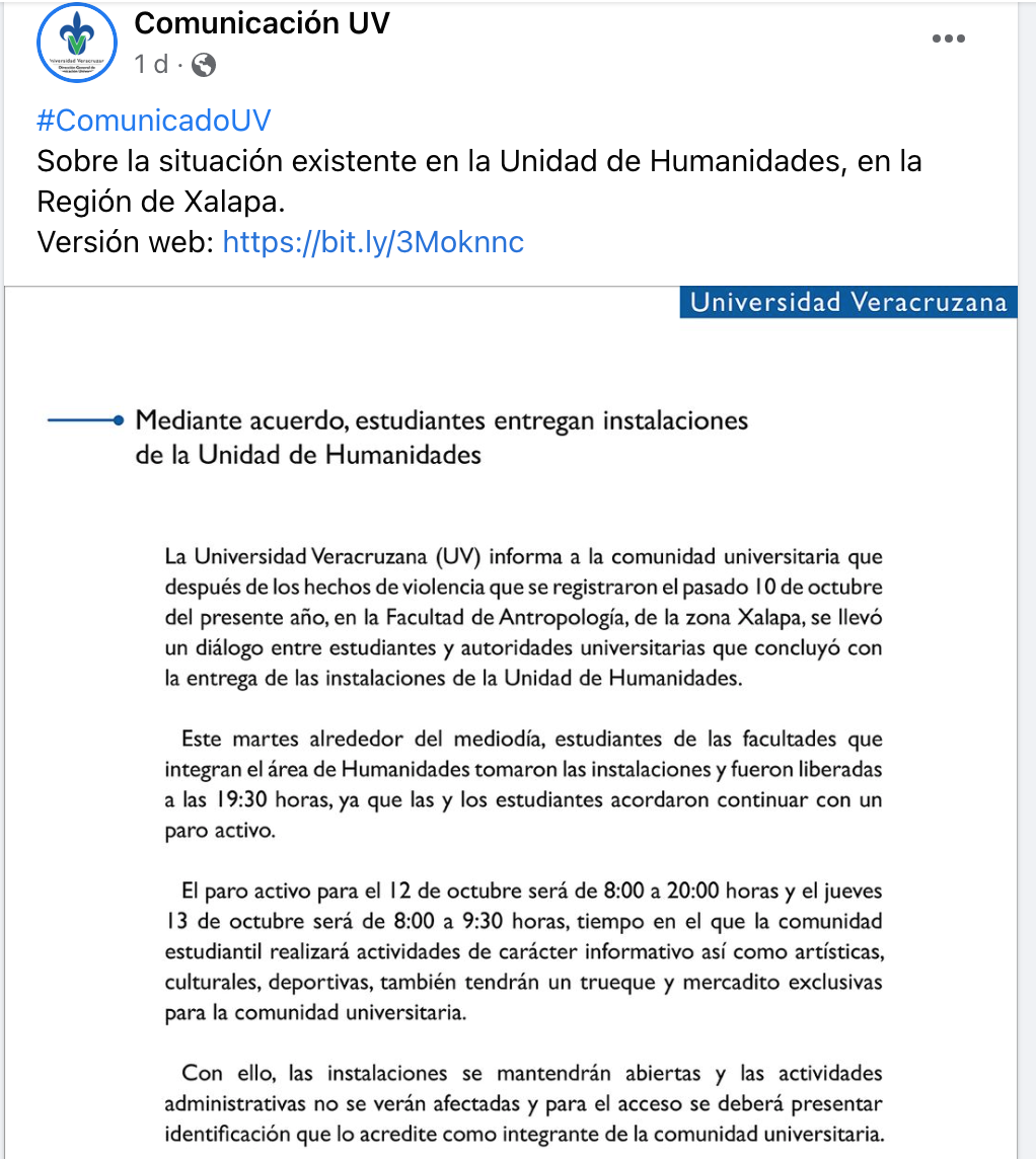 Por medio de un comunicado, la Universidad Veracruzana informó que hubo un diálogo entre estudiantes y autoridades universitarias, lo que permitió la entrega de las instalaciones.