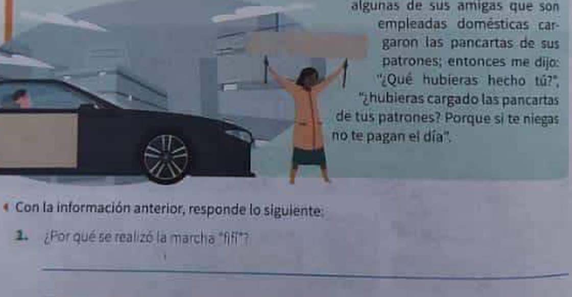 “Seguí viendo mi face y principalmente los memes de la marcha que me dieron mucha risa, pero mi mamá que se enoja y que me regaña porque algunas de sus amigas que son empleadas domésticas cargaron las pancartas de sus patrones y me dijo: ¿Qué hubieras hecho tú? ¿Hubieras cargado las pancartas de tus patrones? Porque si te niegas no te pagan el día”, se lee en el escrito publicado en libros de bachillerato.