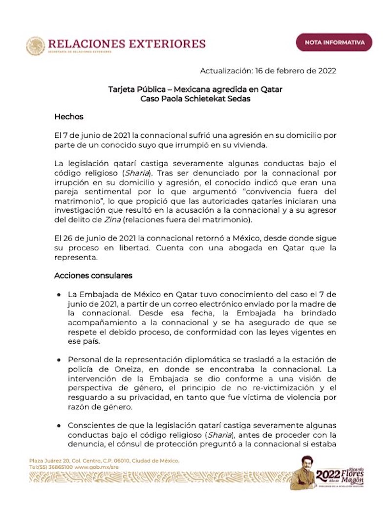 La denuncia de Paola Schietekat llegó a medios nacionales y en este contexto, en redes se difundió la supuesta respuesta de la Embajada de México en Qatar ,que aseguró tres cosas contrarias al testimonio de la economista: