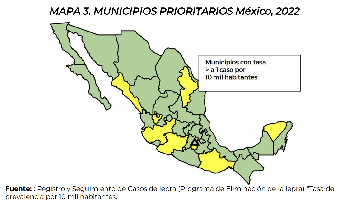 Actualmente hay 300 casos registrados en el sistema de información no automatizada en 28 estados del país. Pero, hay 6 estados que registraron municipios con una tasa de prevalencia mayor a 1 caso por cada 10 mil habitantes, es por eso que los consideraron como “municipios prioritarios para lepra”.